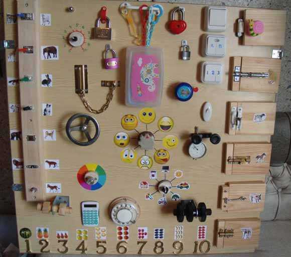 - Подарок своими руками. Еще одна нестареющая истина, если у ребенка есть буквально все, а также в противоположной ситуации, если нет возможности приобрести понравившуюся игрушку. Конечно, джип на радиоуправлении самостоятельно изготовить будет несколько проблематично, но вот сшить яркий красочный коврик для развития по фото или соорудить уличную игровую площадку вполне по силам любящим родителям. Для малышей будет крайне интересным стенд со всевозможными «взрослыми» приспособлениями, которые можно беспрепятственно изучать. Подобный образец можно увидеть на фото.