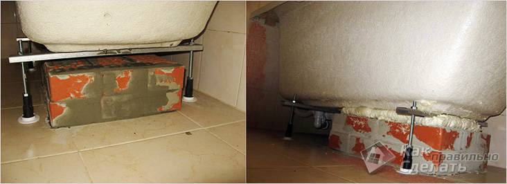 Саму ванну можно установить на заранее подготовленные установочные элементы или конструкцию выложенную, например, из кирпичей или пеноблоков.