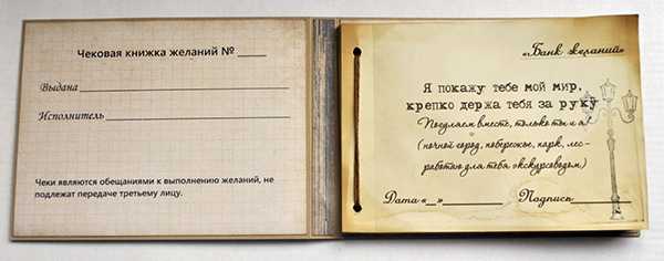 Самодельная чековая книжка желаний — это блокнот с плотными страницами, каждая из которых посвящена одному желанию. Примеры таких страниц: “Прощение одной обиды”, “Романтический ужин при свечах”, “Эротический массаж”, “Незабываемое свидание с экстримом”, “Совместный просмотр романтического фильма”, “Завтрак и кофе в постель”.