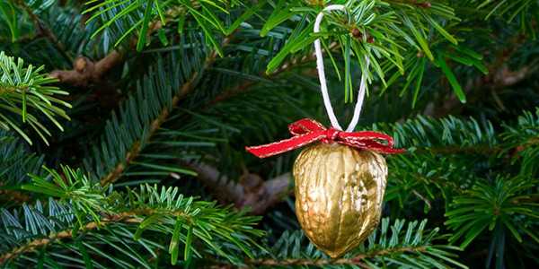 Две половинки скорлупы нужно склеить между собой и покрыть золотистой или серебристой краской. Перед склеиванием вложите внутрь записку, свернутое трубочкой, и вставьте между половинками узелок от тесемки — за нее орешки можно подвешивать на елку. На готовую поделку повяжите яркие бантики.