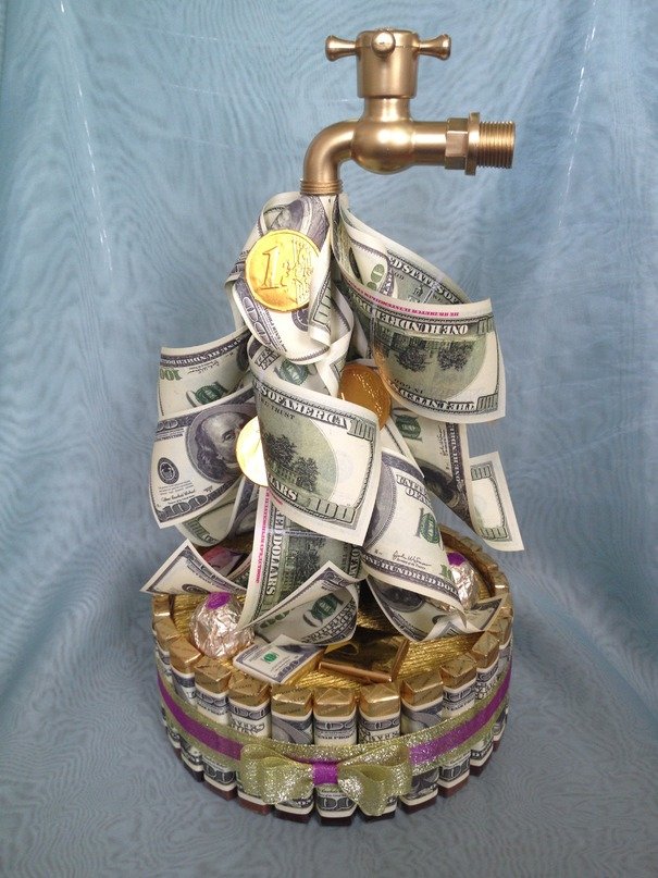 Такой шарик каждому захочется получить в подарок! Это можно заказать, хотя сделать собственноручно – проще простого. Купите качественный, прочный воздушный шарик, желательно – прозрачный. Поместите в него аккуратно свернутые купюры, насыпьте яркие блестки и конфетти, и после этого надуйте. Лучше, если шарик будет надут гелием. Привяжите яркую ленточку – и радуйте виновника торжества! - На свадьбу или большой юбилей красивым подарком станет денежный торт. Он удивит всех гостей, а виновников торжества приведет в полный восторг! Роскошный торт из денег украсит любое торжество, и гарантированно поднимет настроение всем. Его также можно заказать, но сделать своими руками вовсе несложно. Можно добавить не только красивый декор, но и конфеты – тогда будет еще приятнее.