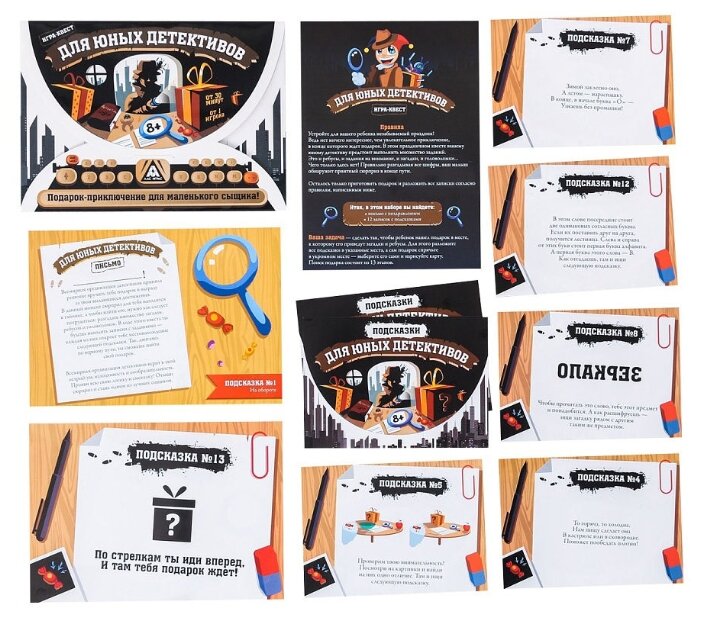 - Заготовить задания для квеста. Придумать подсказки к поиску подарка, красиво оформить, разложить по «тайникам». Следите за тем, чтобы они были надежно спрятаны.