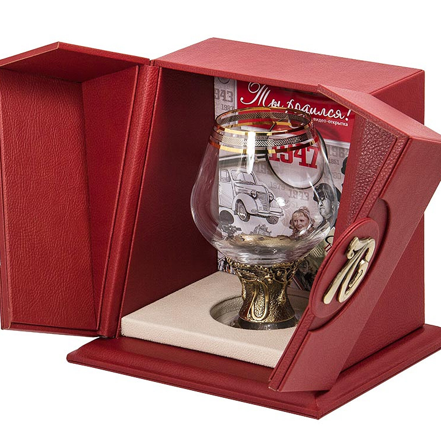 Сюда входят подарочные медали и панно, стаканы с подстаканниками и оригинальные бокалы, на которых указано «80 лет».