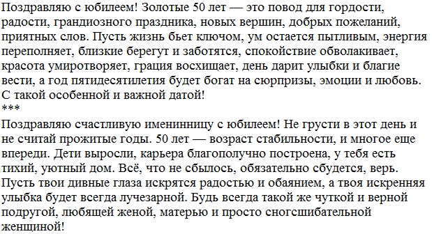 Супруга именинника поздравляет мужа, рассказывает о его жизни, семье, припоминая все лучшие качества. А после предлагает вместе спеть песню, слова нужно заранее разложить на столах. Начинают ее только дамы, во втором куплете вступают только мужчины, третий поют вместе.