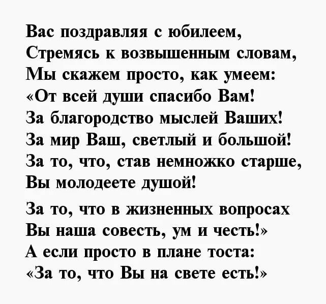 Чтоб был прекрасным жизни каждый миг, Чтоб юбиляр наш истину постиг! Чтоб был всегда его богатым дом! Чтоб внуков не избаловал притом!