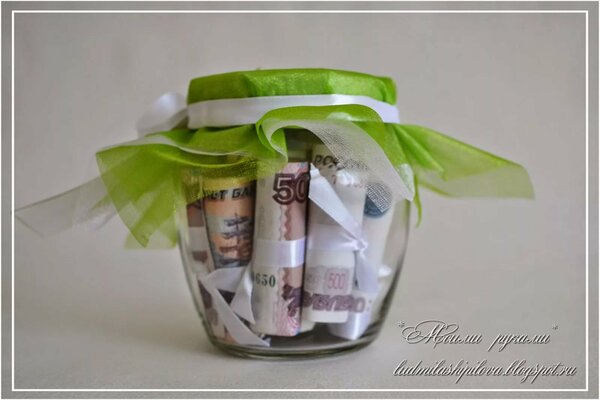 - Стеклянная банка. В неё кладут красивые купюры и монетки (если настоящих денег не хватит, то смешивают с фальшивыми), а сверху можно наклеить смешные надписи или пожелания и украсить тканью и лентами.
